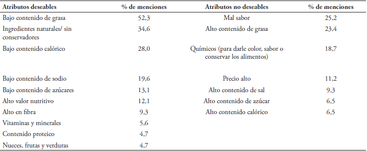 La Tabla 2 resume la información relacionada con los atributos nutrimentales deseables y no deseables en una botana saludable (Tudoran, Olsen, & Dopico, 2009), pero incluye además otros atributos como el sabor, uno de los atributos tradicionales que el consumidor considera en su decisión de compra de alimentos (Maehle, Iversen, Hem, & Otnes, 2015).