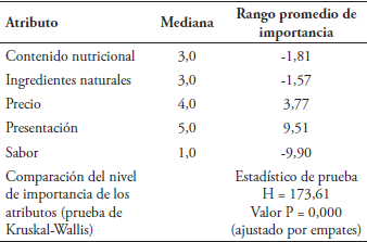 Los niveles medianos de importancia asignados a los elementos críticos de una botana saludable se reportan en la Tabla 3, comparándose su importancia mediante la prueba no paramétrica de Kruskal y Wallis. El sabor del producto resulta ser el atributo más importante para el consumidor, por encima de los atributos distintivos de la botana saludable que son sus ingredientes naturales y bajo contenido calórico. La gran influencia que tiene el sabor del producto sobre la decisión de compra ha sido reconocida en otras investigaciones sobre prácticas alimenticias en el contexto mexicano (Carrete y Arroyo, 2014; Sebastián-Ponce, Sanz-Valero, & Wanden-Berghe, 2011).