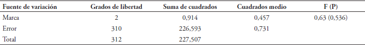 Para reforzar esta apreciación, se evaluó hasta dónde los consumidores consideran creíble que una marca de botanas tradicionales pueda transferir y ampliar sus capacidades para desarrollar extensiones saludables. Las mediciones de credibilidad hacia marcas con diferente posicionamiento -el líder en el mercado (Sabritas), el seguidor inmediato (Barcel) y una marca con presencia limitada (Bokados)- fue la variable de respuesta. Los scores de credibilidad asignados por los entrevistados a cada una de las tres marcas, en cuanto a sus capacidades y recursos para crear botanas saludables, se compararon a través de un Análisis de Varianza (ANDEVA). Los resultados del análisis se reportan en la Tabla 5 y permiten establecer que las tres marcas tuvieron niveles de credibilidad medios estadísticamente iguales. El análisis gráfico de los residuos indicó que los supuestos básicos de independencia, varianza constante y normalidad son válidos.