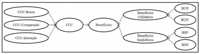 Por sua vez, os Benefícios do CCC são de dois tipos (utilitários e simbólicos), que podem ser subdivididos em positivos e negativos. O CCC exerce influência similar sobre os benefícios utilitários e simbólicos, vindo principalmente da comparação de produtos/preços, corroborando estudos de Foxall (2005, 2010) e o modelo da presente pesquisa, inspirada no Modelo da Perspectiva Comportamental.