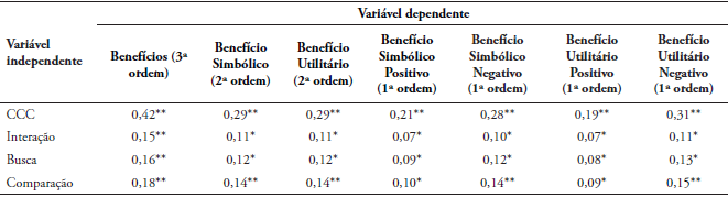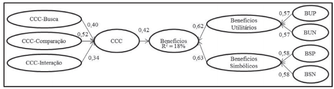 Percebe-se que, quanto maior a adoção do CCC, maior a percepção de alcance de Benefícios (B = 0,42; p ≤ 0,01), predito por todos os constructos de primeira ordem do CCC, especialmente da comparação de produtos/preços (B = 0,18; p ≤ 0,01). Observa-se que, quanto maior a adoção do CCC, maior a percepção de alcance do Benefício Simbólico (B = 0,29; p ≤ 0,01) e do Benefício Utilitário (B = 0,29; p ≤ 0,01), preditos de forma similar para ambos por todos os constructos de primeira ordem do CCC, especialmente da comparação de produtos/preços (B = 0,14; p ≤ 0,01). E, finalmente, quanto maior a adoção do CCC, maior a percepção de alcance de todos os benefícios de primeira ordem, principalmente o Benefício Utilitário Negativo (B = 0,31; p ≤ 0,01) e o Benefício Simbólico Negativo (B = 0,28; p ≤ 0,01). Todos foram preditos pelo fator de primeira ordem do CCC, especialmente da comparação de produtos/preços (variando de B = 0,09 a 0,15).