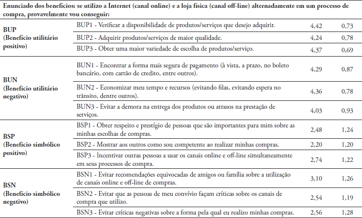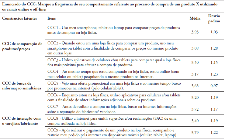 Como resultado dessa fase, eliminaram-se alguns itens de ambas as escalas e alteraram-se as redações de alguns deles e do enunciado. Na versão final, o conjunto das 9 sentenças para o CCC utilizou uma escala de frequência de 5 pontos (1 = nunca; 2 = raramente; 3 = às vezes; 4 = frequentemente; 5 = sempre) para averiguar a adoção da utilização alternada dos canais online e off-line em um processo de compra.