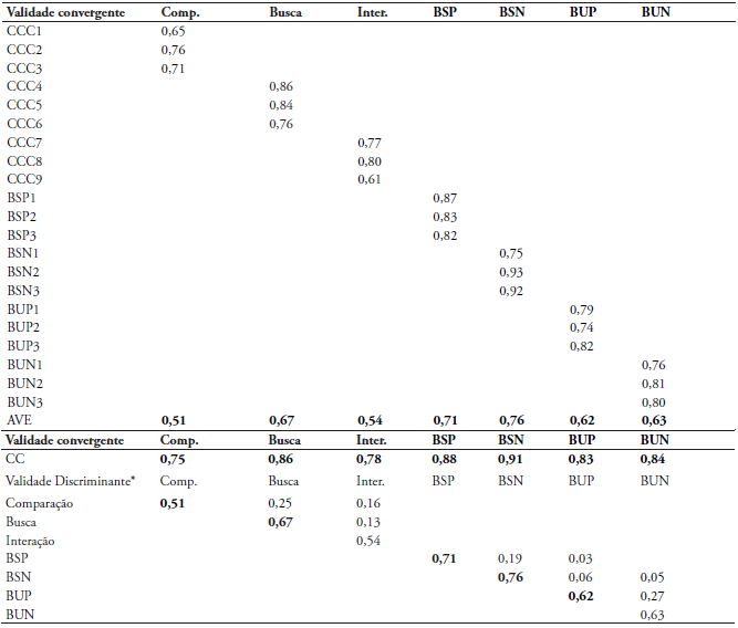 O teste final de validade convergente (parte superior da Tabela 2) indicou que os carregamentos dos constructos de primeira ordem são significativos e que há evidências de que as variáveis observáveis têm validade convergente. Todos os constructos confirmados pela AFC tiveram a Variância Média Extraída (AVE) superior a 0,50.