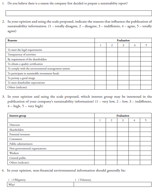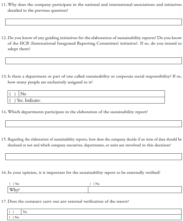 The interview addresses the following aspects: means used by companies to publish sustainability information; reasons for the publication of sustainability information; stakeholders and publication of sustainability information; participation of companies in the sustainable investment stock index and in associations or initiatives and the reasons for their participation; elaboration and publication of sustainability reports; and external verification of the sustainability report.