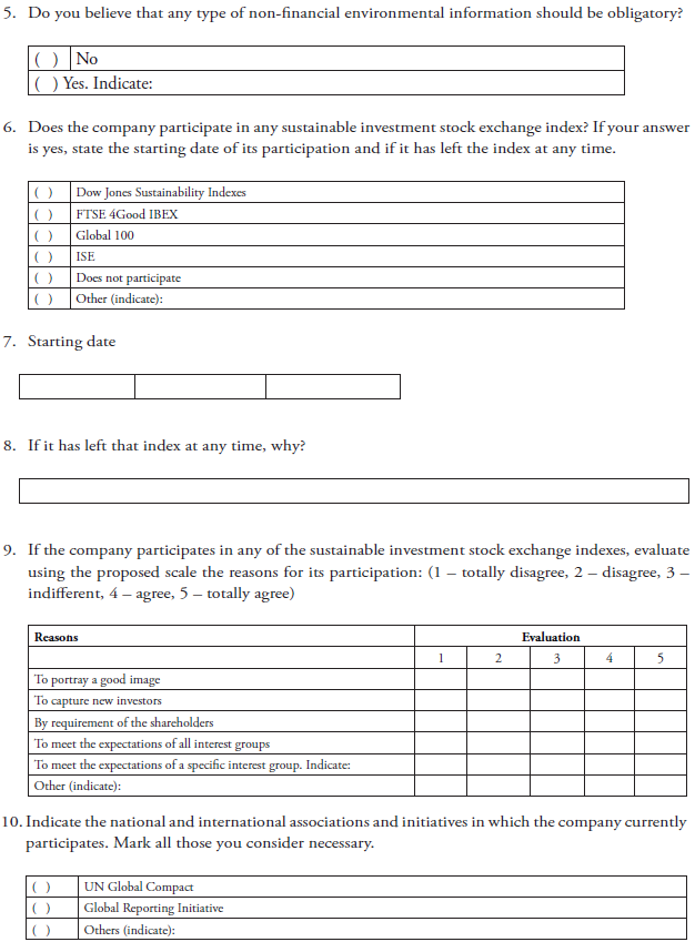 O›Dwyer (2002) conducted a study of 27 Irish companies to investigate the factors that influence environmental disclosure. The results indicate that managers do not use sustainability information as a mechanism to achieve legitimacy. Albelda et al. (2007) investigated environmental management and accounting practices in 10 Spanish companies. The study identified factors that can influence environmental performance, such as: employee awareness, knowledge of the environment, the skills and experience of employees, the commitment of managers, the coordination of cross-functionalities, the integration of environmental issues into the strategic planning process, and the use of management accounting practices.
