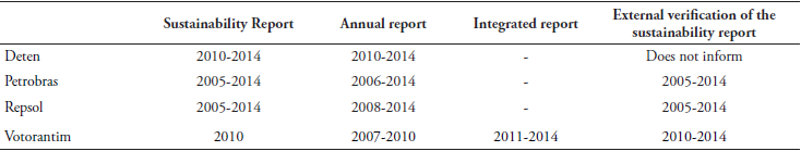 Table 1 shows the reports available on the web pages of the companies analyzed in the study. It is possible to observe a wide availability of reports. Votorantim stands out for having published integrated reports since 2011.