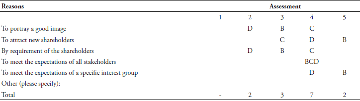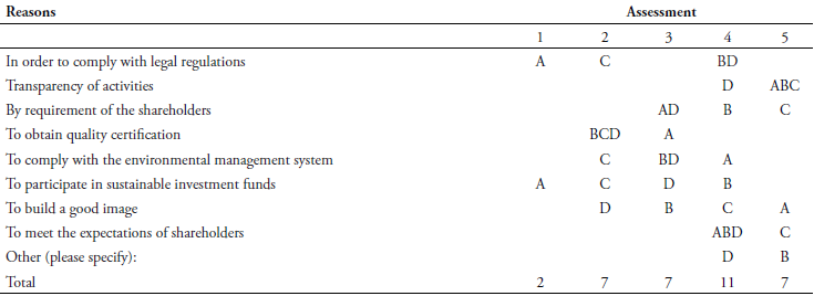 Table 2 shows in more detail the reasons that influence the publication of information on sustainability and the frequency of answer options. It is noted that three of the companies surveyed are “totally in agreement” and one “agrees” that transparency of activities is one of the main reasons for the publication of information on sustainability, which confirms the need to transform traditional positions (Husillos, 2007). Along this same line of argumentation, three of the companies studied are also “in agreement” that meeting the expectations of shareholders is one of the main reasons for the disclosure of such information. However, company B adds an additional reason to justify the disclosure: