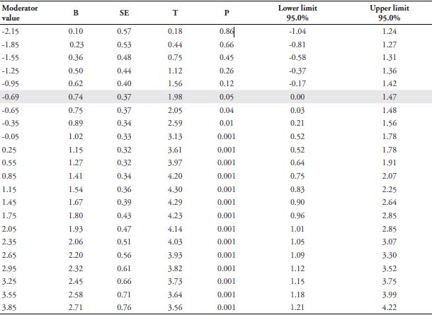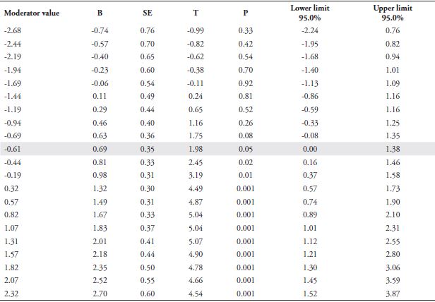 The interaction of the variables of ego depletion (depleted = 1, not depleted = 0) and the regulatory focus on promotion (M = 4.69, SD = 1.27) with the dependent variable was significant (t(142) = 2.83, p<0.01). In order to decompose the interaction, the Johnson-Neyman (floodlight) technique was used to identify the range(s) of the focus-on-promotion variable in which the simple effect of ego-depletion manipulation was significant (for this analysis, according to the technique, a p-value of 0.05 was considered). The moderator value that defines the significant Johnson-Neyman region is -0.61 in relation to the average of the focus-on-promotion variable.