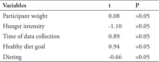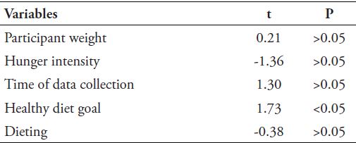 A scale adapted from Stunkard and Messick (1985) measured the dietary restrictions of the individuals to serve as a control variable, along with the mood variable. Other variables that were also used as additional control variables were participant weight, hunger intensity, data collection time, healthy diet goals, and dieting. In addition, two questions ended the data collection, in order to evaluate if they had been able to establish the purpose of the research.