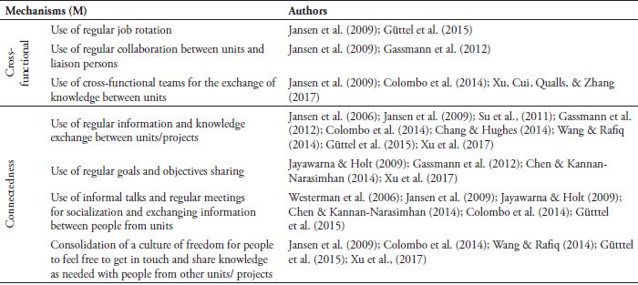 Jansen et al. (2009) considers two types of organizational integration mechanisms that have been associated with knowledge combination and integration in dual structures: formal cross-functional interfaces and informal social relations or connectedness. Connectedness relates to the social network that can be established by an organization to enable knowledge exchange. Connectedness affects the ability and motivation to integrate and recombine differentiated knowledge sources in different units (Jansen et al., 2009). Formal cross-functional interface mechanisms are related to mechanisms such as liaison personnel, job rotation, cross-functional teams, and all mechanisms that enable deeper knowledge flows across exploratory and exploitative units (Jansen et al., 2009). These two types of mechanisms are observed in field research. Table 1 shows the main mechanisms and authors related.