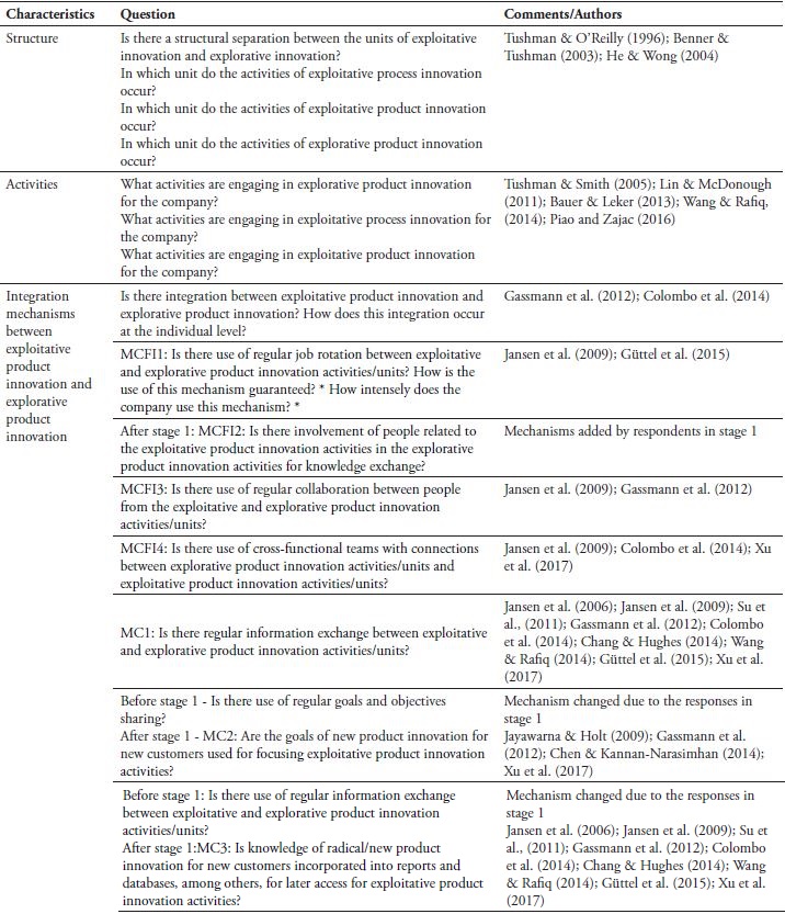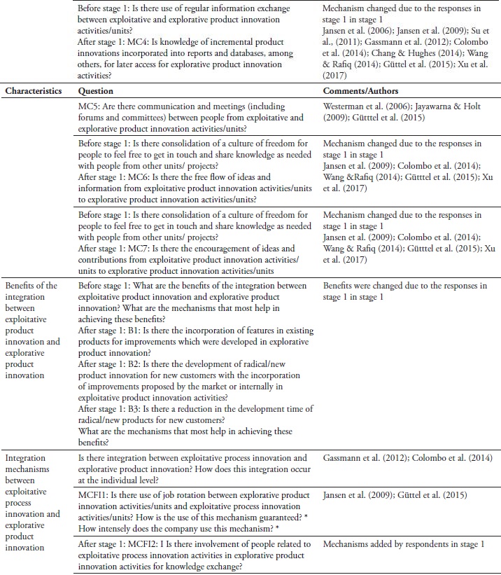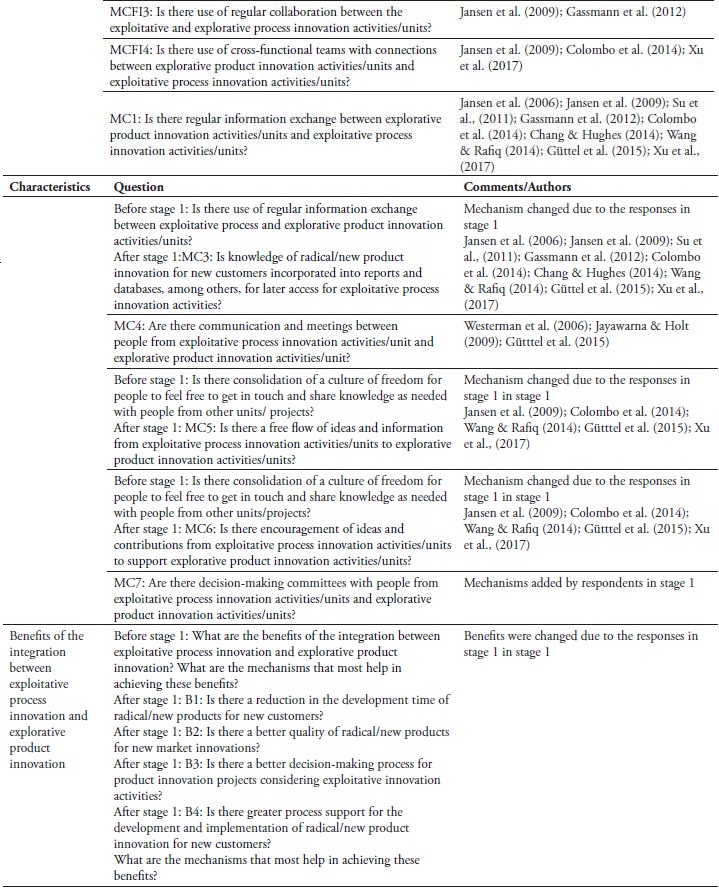 Table 2 shows the questions related to each mechanism or benefit, some comments, and the authors reference. The abbreviations shown in table 2 - MCFI and MC - mean, respectively, mechanisms of cross-functional interfaces and mechanisms of connectedness, as established by Jensen et al. (2009). After stage 1, some questions were modified, as it is possible to observe in the table.