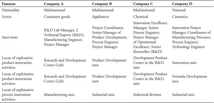 The study examined four large Brazilian companies. They are considered innovation leaders in their segments. Table 3 presents an overview of the companies studied and of the respondents. Each company has a research and development unit in Brazil (usually focused on product R&D) and develops radical and incremental products, process innovation activities, and research into new technologies.