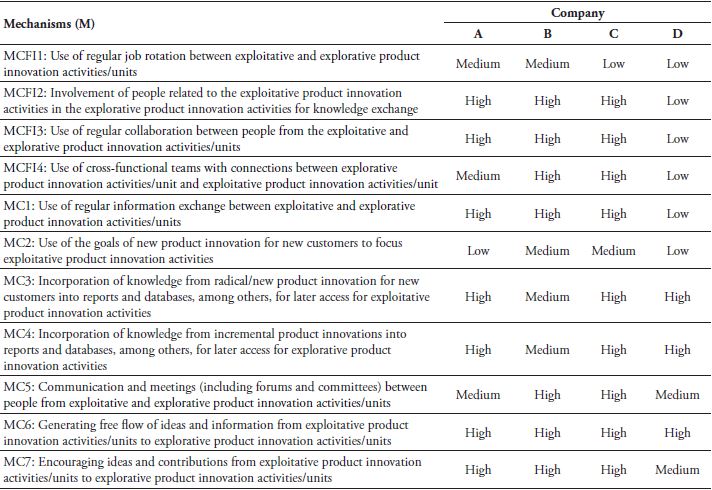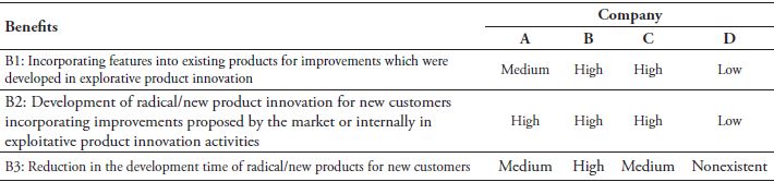 All the companies presented mechanisms for integrating exploitation and exploration independently of the relationship analyzed. Observing the relationship between exploitative product innovation and explorative product innovation and considering cross-functional interface mechanisms, the most used mechanisms were those related with collaboration and involvement for knowledge exchange. Considering connectedness mechanisms, the most applied were the mechanisms related to cultural issues: enabling the free flow of ideas and encouraging new ideas and the exchange of formal knowledge. The most apparent benefit is the development of radical innovation incorporating improvements proposed by the market or internally in exploitative product innovation activities, and this benefit is associated with collaboration, culture, and alignment via forums and committees.