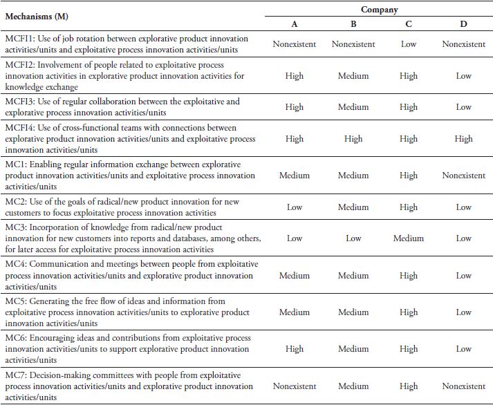 The integration mechanisms related to exploration-exploitation innovation were identified in the literature and although there are few studies, compiling such mechanisms can foster future research. In addition, the mechanisms were confirmed and analyzed in a field study, which enabled the research to be carried out contemplating not only the division between exploitative and explorative innovation activities, but also including the division between product and process innovation.