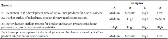 The reported benefits include incorporating improvement features developed in explorative product innovation into existing products (mainly related to the mechanisms MCIF4, MC1, and MC3), the development of radical product innovation in explorative innovation activities incorporating improvements proposed by the market or internally (MCFI2, MCIF4, MC5, MC6, and MC7), and faster development of radical products (MCIF4, MC1, and MC5). Integration mechanisms enable collaboration and connection between activities, improving both existing products as well as radically innovative products. The benefits reported by the respondents are shown in table 5. Greater use of mechanisms led to greater reported benefits.