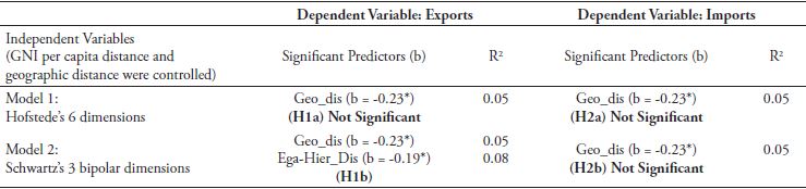 As can be seen in Table 1, none of Hofstede’s dimensions predicted imports or exports (model 1), while Schwartz’s bipolar Egalitarianism-Hierarchy distance predicted imports. Thus, only H1b was supported while H1a, H2a and H2b were not supported. The bipolar Egalitarianism-Hierarchy distance was negatively related to imports (b = -0.19, P<0.05), suggesting that the higher the Egalitarianism-Hierarchy distance between countries, the smaller the import activities between them, which was consistent with our prediction that cultural similarity drives trade.