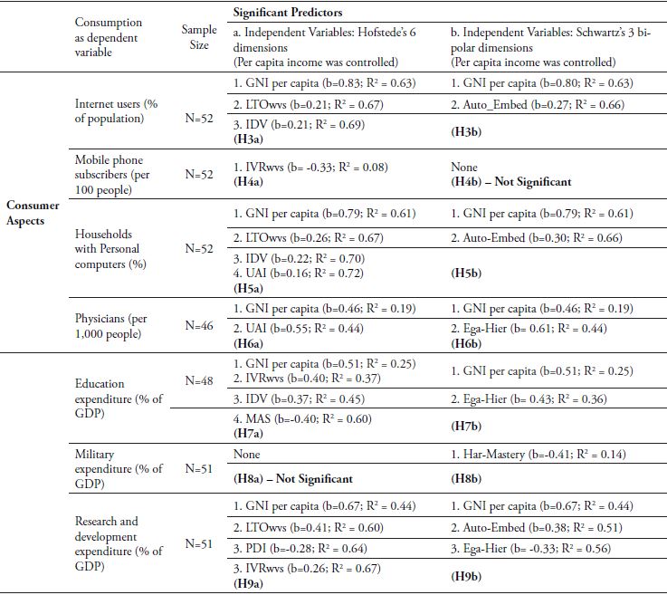 The present study attempted to examine the consumption convergence-divergence hypothesis by looking at four personal consumption aspects (internet users, mobile phone subscribers, personal computers owners and physicians) using more recent data (2011-2015). People in low UA countries are more open to change, more willing to take risks and more receptive to new products or ideas (Hofstede, 2001). Consequently, they were expected to use new products, such as mobile phones, personal computers and internet services. Hofstede (2001) also found more doctors per capita in high UA and high IDV countries because of a belief in expert knowledge and living independently. Thus, it was expected that UA and IDV would be positively related to the number of physicians per capita. In short, at least one of Hofstede’s dimensions was expected to predict consumer consumption, using data from 2011 to 2015.