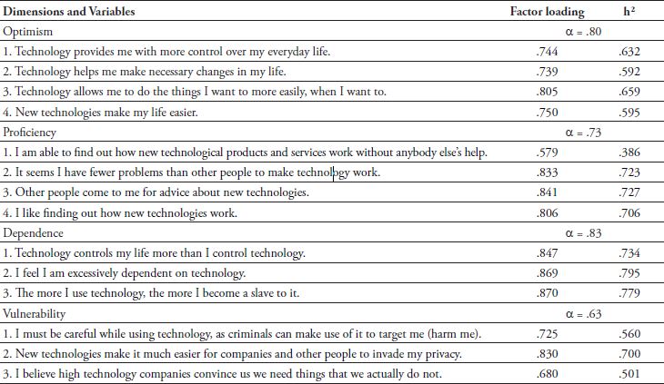 As observed, the procedure for the TAP factorial structure analysis provides a great contribution to the subsequent analysis, since the factors produced by the TAP scale (optimism, proficiency, dependence, vulnerability) present conceptual coherence when the EFA is carried out after the Varimax rotation. In addition, the results found in this research reinforce those found in the studies of Ratchford and Barnhart (2012), as the same factorial structure was observed with regard to the dimensions found and their respective measurement indicators.