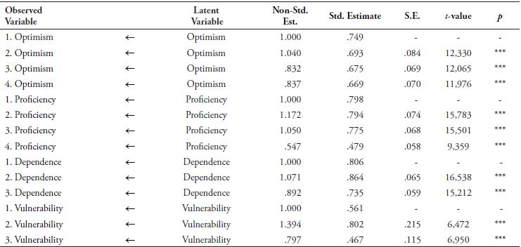 The Bartlett's test of sphericity result (1995.559; p < .000) and the KMO measure (0.779) presented values considered as satisfactory (Malhotra, 2012; Hair et al., 2009). The values for communality and factor loading remained within those proposed by the literature and are shown in Table 1. Therefore, with the exception of proficiency item 1 (h2 = 0.386), all the others presented communality above the exclusion criteria of 0.5 proposed by Hair et al (2009). However, according to the authors, when items or constructs present low communalities, a sample higher than three hundred cases assists with the recovery of population parameters, such as is the case of the sample used in this study. For that reason, and also in view of the indicator’s importance, the parity of the original study, and the stability of other analysis predictors, the indicator was kept in order to see how it would behave in the confirmatory analysis. The scale explained variance after the Varimax rotation presented a solution with 4 factors, and an explained variance of 64.92% (Hair et al., 2009).