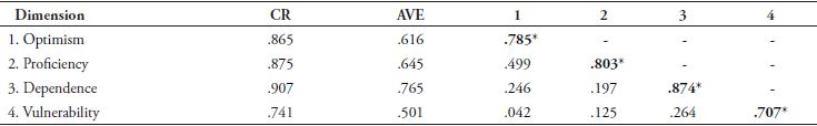 With respect to the composite reliability of the constructs, this is an analysis that represents the total amount of the true score variance compared with the total score variance (Malhotra, 2012), where values higher than 0.70 are the acceptable index for confirmatory studies (Hair et al., 2005).