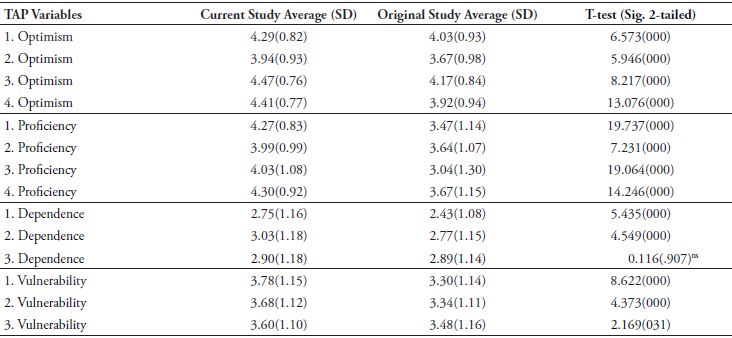 With the purpose of measuring the propensity for technology adoption by consumers in this study, the T-test (one sample) was performed by comparing the averages of each TAP scale variable in this study with data provided by the study of Ratchford and Barnhart (2012). Table 4 presents the results found in this comparison.