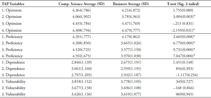As observed, only one of the dimensions (proficiency) that form the TAP scale presented a significantly different result (t (390) = 8.566; p < 0.000). It is important to stress that, through the T-test performed for each variable of the proficiency construct, all of them presented higher averages for Computer Science students than for Business students. This result reinforces the idea that the Computer Science School respondents present more proficiency (confidence in their own capacity to easily learn and quickly use new technologies, as well as the feeling of being technologically competent) in technology adoption than the Business School respondents. Confirmations regarding other dimensions cannot be made by means of this study.