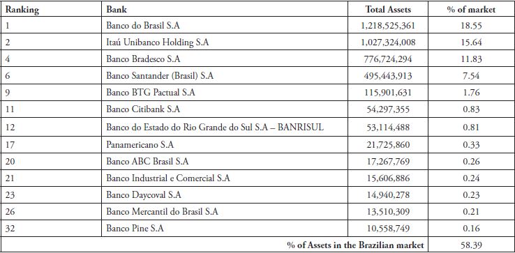Although the range of the research is limited to listed banks and does not allow for direct inferences regarding banks that are not listed, it is important to emphasize that among the banks in the sample there five (5) of the ten (10) biggest banks in Brazil, four (4) banks from among the 11th to 20th biggest, and four (4) banks from among the 21st to 35th biggest. Thus, the thirteen (13) biggest banks listed are from among the thirty-five (35) biggest Brazilian banks, as according to data from 12/31/2013, which assures a certain level of diversity in the sample regarding the area. Besides, the banks used have, jointly, almost 60% of the market share of the sector, as according to Table 1.
