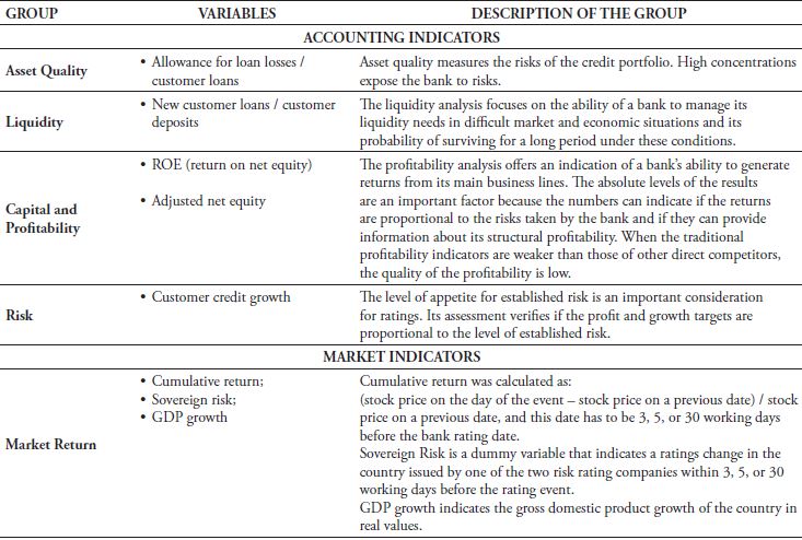 In this study, the accounting-based indicators were divided into four (4) groups: Asset Quality; Liquidity; Capital and Profitability; and Risk, as in the methodology used by the rating agencies Moody’s (2016), Fitch (2015), and Standard and Poor’s (2011). The market-based indicators were the banks’ market prices (Distinguin, Hasan, & Tarazi, 2013), GDP growth (Gande & Parsley, 2014; Acharya, Drecshler, & Schnabl, 2014), and sovereign ratings changes (Adelino & Ferreira, 2016).