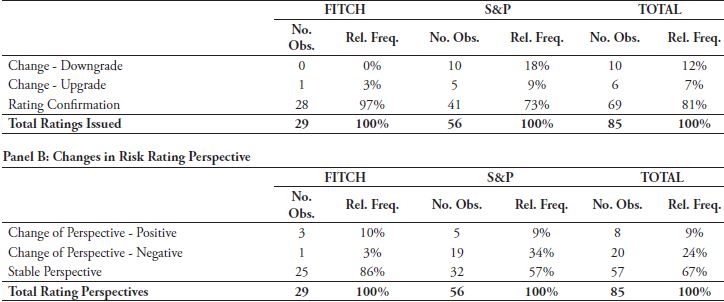 Regarding changes of perspective, Panel B in Table 3 shows that S&P also made more changes of perspective than Fitch. In total, Panel B presents eight (8) positive changes of perspective and twenty (20) negative ones out of 85 perspectives. Change of perspective is an important piece of data because it demonstrates a possible future rating change for the bank (Moody’s, 2016; Fitch, 2015; Standard & Poor’s, 2011). Even if the information about rating demonstrates a stable perspective, the next disclosure might increase or decrease the rating without a previous review of the perspective since the context and analyses performed by the CRA ensure such action (Moody’s, 2016; Fitch, 2015; Standard & Poor’s, 2011).