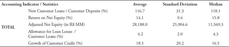 The descriptive statistics of the accounting indicators are represented in Table 4. These include the average, the standard deviation, and the median of each accounting indicator within the period analyzed. Table 4 presents an average level of 4.2% allowance for losses, which is considered as “acceptable” according to Fitch (2014). In addition, the average ROE was 14.1% within this period (Fitch, 2014), showing the high profitability of the segment. The non-tabular results show an increasing growth in loans (18.5%) between 2010 and 2014, which was possibly caused by the decrease in the interest rate charged by the banks within this period.