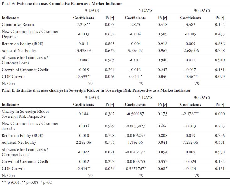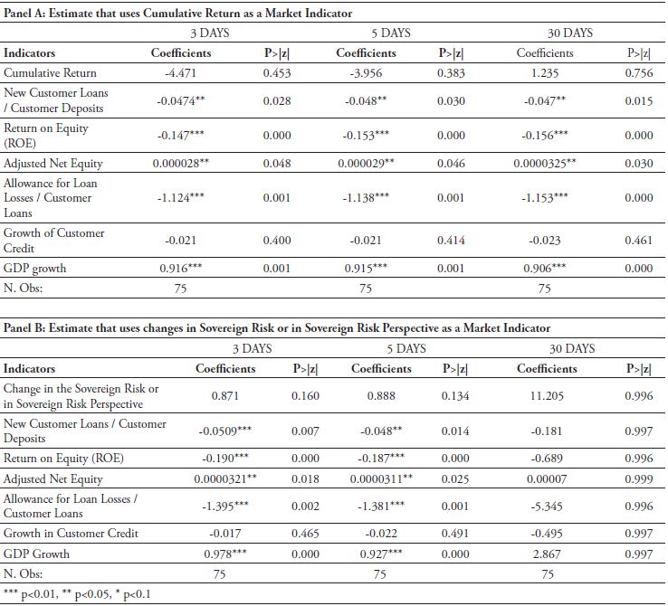 Regarding political and macroeconomic aspects, the literature shows that banks are intimately connected to their governments due to their dependency on domestic economic activity, which tends to not only affect government fiscal revenues but also revenues from private and public banks (Gropp, Vesala, & Vulpes, 2006). As a consequence of this relationship, deterioration in the fiscal situation of the government can affect several financial elements, including funding for credit operations, default levels, savings account resources, and investment redemption, among others financial factors (Bolton & Jeanne, 2011). However, as is shown in the analysis of the variable “Changes in Sovereign Risk or in Sovereign Risk Perspective” in Panel B of Table 5, an increase in rating or a positive rating perspective in the country does not present a significant relationship with upgrades in the banks for the 3, 5, and 30 days before the release issued by the CRAs.
