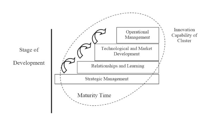 The proposed model of cluster innovation capability presented in Figure 1 is a dynamic model, as capabilities vary in their intensities according to the development stage of the cluster and its maturity time. Depending on their stage of its development, clusters present a set of characteristics that influence their innovation and relationships with the firms and with the region in which they operate (Menzel & Fornahl, 2010). It was identified that the innovation capability of a cluster is not the same since its emergence; it is built as the cluster develops.
