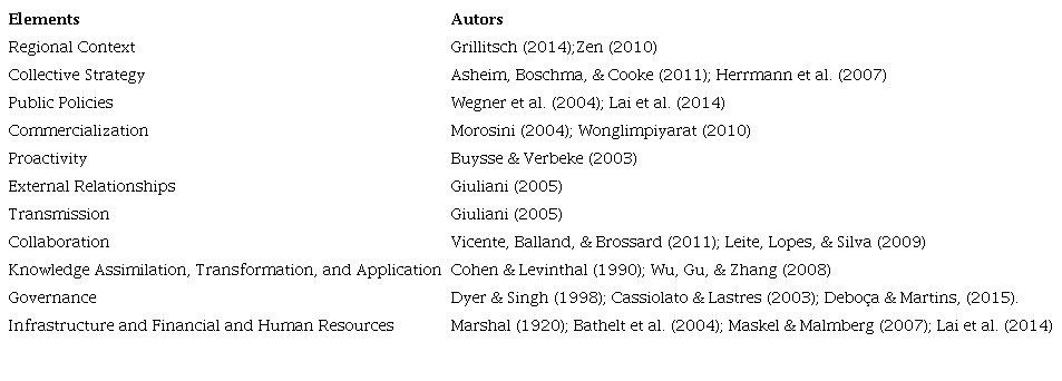 Finally, it is observed that these elements can be more or less developed according to the cluster analyzed; however, their existence must be kept. Thus, they will serve as the basis for identifying the innovation capability of a cluster and to verify how it is developed. The methodological procedures section will provide more details on the present research.