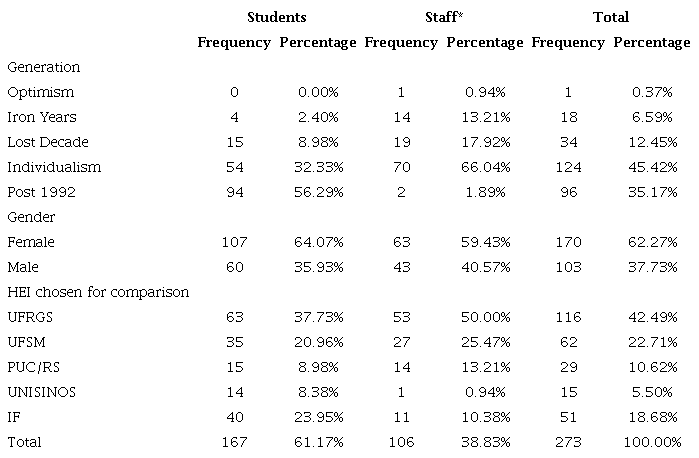 The sample is not representative and defined by convenience and by quotas. 350 questionnaires were sent to 12 different campuses seeking to maintain the proportionality of the sample in relation to the distribution of the population in the campuses. 323 questionnaires came back, of which 50 were eliminated due to completion problems, resulting in a final sample of 273 valid questionnaires.