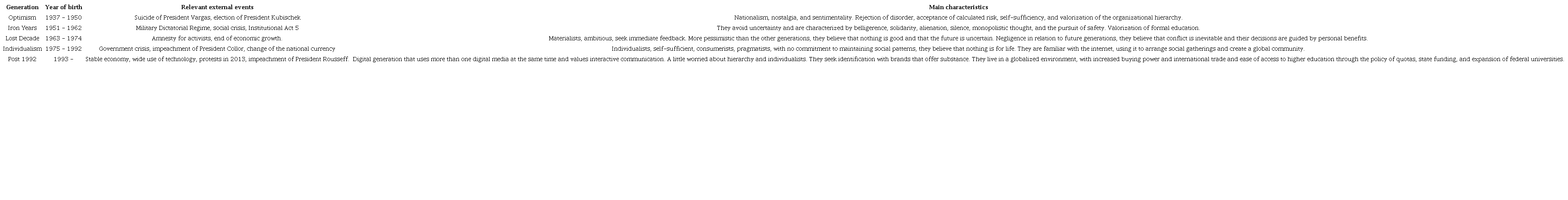 According to Gao, Zhang, and Huang (2017), generational cohorts might be considered a type of national subculture, in that they hold a set of common values, shaped by the social and economic events of a specific historical moment, occurring during a certain period of the individual cycle of life. As a result, differences among cultures, countries, and histories may shape different generational cohorts in each country. Fernández-Durán (2015) proposes that external events responsible for defining the personal values of individuals from generational cohorts are important events in a country’s history in the areas of economics, politics, culture, nature, and technology. Along these lines, proposals of specific classifications for generational cohorts are identified in Brazil (Ikeda, Campomar, & Pereira, 2008; Ikeda & Feitosa, 2011; Motta & Schewe, 2008), Mexico (Fernández-Durán, 2015), and China (Gao, Zhang, & Huang, 2017; Tang, Wang, & Zhang, 2017). Table 1 presents the generational cohorts proposed for the Brazilian context.