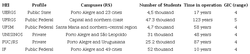 HEIs from the state of Rio Grande do Sul with the greatest “continuous GIC” indicators were selected, removing the Federal University of Health Sciences, because its area of activities is different from that of UERGS. All the HEIs for comparison offer graduation and post-graduation courses in the areas of activity of UERGS.
