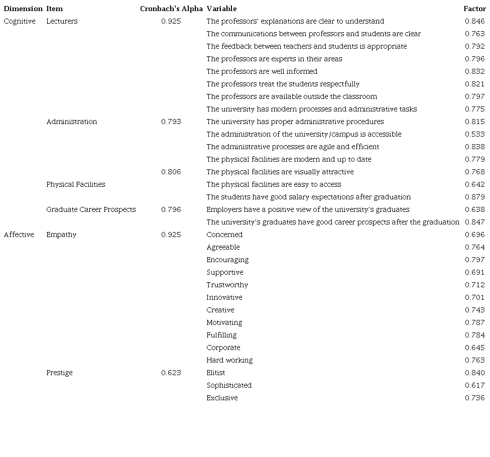 After the factor analysis, a set of 31 attributes of the HEI brand positioning evaluation was obtained, 17 cognitive and 14 affective. The cognitive attributes were grouped into 4 dimensions: Lecturers (7 attributes), Administration (4 attributes), Physical Facilities (3 attributes), and Graduate Career Prospects (3 attributes). The four factors obtained were based on the scales used as a reference for this research (Alwi & Kitchen, 2014; Gray, Fam, & Llanes, 2003). The affective attributes were grouped into 2 dimensions: Empathy (11 attributes) and Prestige (3 attributes). The empathy dimension encompasses three dimensions of the original scale of Alwi and Kitchen (2014): Empathy, Adventurous, and Competence. The prestige dimension is similar to the dimension called “Prestigious” by Alwi and Kitchen (2014).