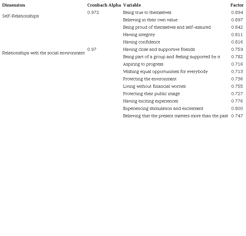 The analysis of the personal values scale data was performed through statistical factor analysis with Varimax rotation.15 factors were obtained, grouped in two dimensions: Self-relationships and Relationships with the Social Environment (Table 4).