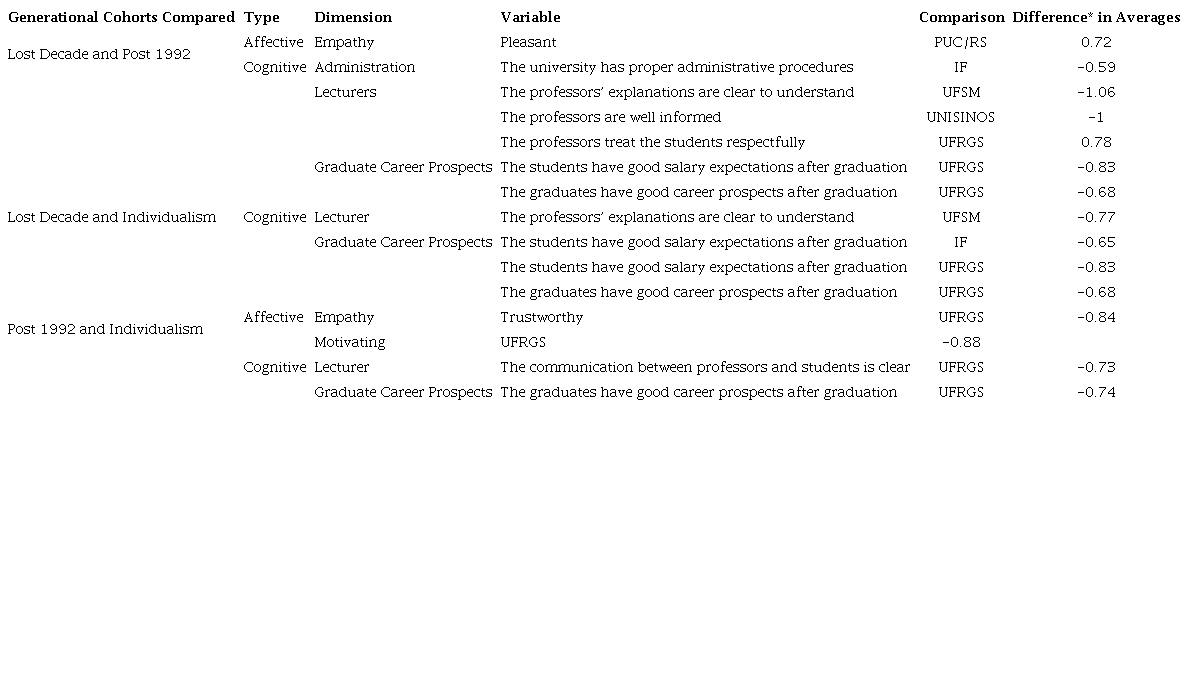 The differences found call for reflections regarding the characteristics of Brazilian cohorts. Studies that consider cohort classifications for the Brazilian context are scarce and the descriptions of Brazilian cohorts found in the academic literature emphasize characteristics of the historical and economic environment experienced by the individuals, connected to the shared relevant external events. Therefore, there is a reduced theoretical framework to compare the results obtained in the research. One of the results that may be compared to the previous literature relates to the Lost Decade cohort. This cohort is described by Motta and Schewe (2008) as being the most pessimistic of the Brazilian cohorts, composed of questioning individuals that believe that nothing can be good. Unlike the description in the literature, the research findings demonstrate that individuals of the Lost Decade cohort perceived the brand positioning of UERGS more positively than individuals of the other cohorts studied. It is possible that the pessimism of those individuals is highlighted in other areas and behaviors; however, it is verified that this characteristic does not apply to the perception of brand positioning in the present study.