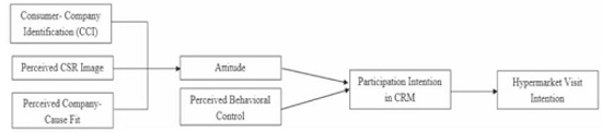Findings: The results show that three variables (perceived CSR image, consumer-company identification and perceived company-cause fit) out of four significantly predicted consumers’ attitude towards CRM. Also, two components (attitude and perceived behavioural control) out of three in the theory of planned behaviour were found to be significantly related to CRM participation intention. Lastly, CRM participation intention was found to influence hypermarket visit intention.
