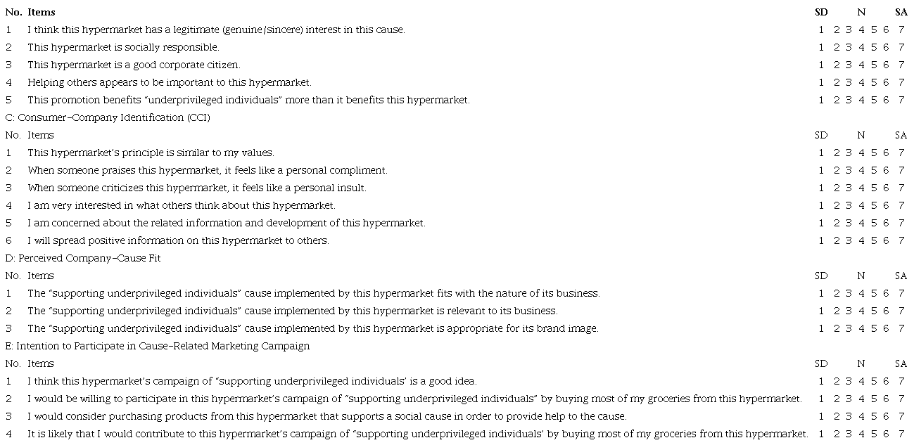 This study has several limitations, which readily provide avenues for future research. Firstly, this study’s explanatory power for CRM attitude is 37%, which indicates a 63% variance that is not explained. That is, some important factors are not included in the framework. Future studies could consider the factors that can improve the attractiveness of the CRM campaign. Examples of these factors are CRM campaign duration (Cui et al., 2003), donation proximity (Zhu et al., 2017) and type of social cause supported (Lafferty & Edmondson, 2014). Secondly, the consumers’ hypermarket visit intention explanatory power was 41%, which shows that a 59% variance was not explained. Thus, future research could contemplate including additional factors into the model that may also influence consumers’ hypermarket visit intention, such as advertising (Anselmsson, 2006), location (Pan & Zinkhan, 2006) and price (Jin & Kim, 2003).