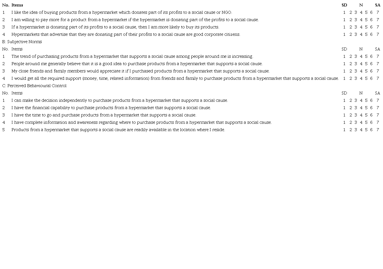 This study investigates the effectiveness of CRM in consumers’ hypermarket visit intention using the TPB model. Its components, namely attitude, subjective norm (SN) and perceived behavioural control (PBC), are used to evaluate consumers’ response to CRM and hypermarket visit intention. This study contributes to the literature in three ways. First, it uses a novel social cause called “supporting underprivileged individuals”, which has the ultimate aim of developing financially independent entrepreneurs. This social cause was created by this study based on suggestions from a focus group interview (forthcoming paper). The CRM literature has commonly focused on causes including diseases such as cancer (Robinson et al., 2012), wildlife and environmental causes such as the World Wildlife Fund and rainforest protection (Chéron et al., 2012), and the homeless (Chang, 2011).