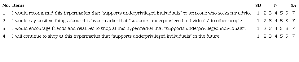 The respondents were asked to rank their most preferred hypermarket (most frequently visited) ranging from 1 to 5 (e.g. Giant, Tesco, AeonBig, Mydin and NSK) and were required to read a hypothetical CRM campaign based on their most preferred hypermarket (Appendix 1) before filling in the questionnaire. In other words, the respondent’s most preferred hypermarket would be the hypermarket that they may identify with, as it is their most frequently visited hypermarket. Also, the social cause (supporting underprivileged individuals) in Appendix 1 was selected because the NGO’s (CASE) aim was to develop or train these underprivileged individuals in entrepreneurship skills so that they could survive on their own by starting small businesses in their community. This cause is associated with the hypermarkets, where products produced by these underprivileged individuals may be future supplies of the hypermarkets.