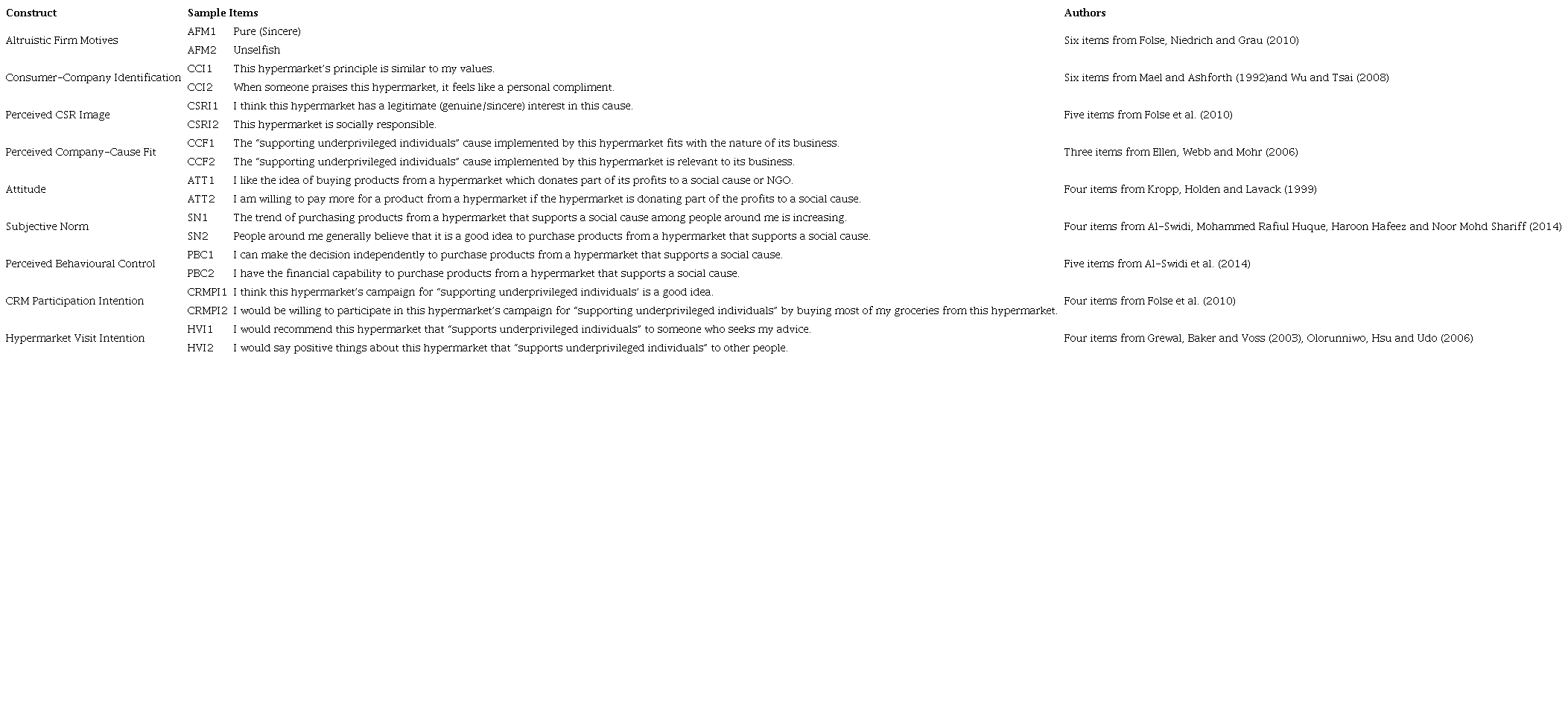 Second, the study contributes to the CRM literature by introducing a framework with a stronger theoretical background, that is, TPB. So far, CRM frameworks have not been rooted in a solid theoretical base. For example, most CRM studies have used multiple supporting theories, such as social identity theory (Vanhamme et al., 2012), attribution theory (Cui et al., 2003) and information integration theory (Samu & Wymer, 2009), to explain individual construct relationships with consumers’ response to CRM. Third, the study extends the use of CRM to the hypermarket context. The applicability of CRM in the hypermarket context can provide valuable insights for hypermarket managers. The antecedents, namely altruistic firm motives (AFM), consumer-company identification (CCI), perceived CSR image (CSRI) and perceived company-cause fit (CCF), are hypothesised to influence attitudes towards CRM, which can help managers make informed decisions on CRM implementation.