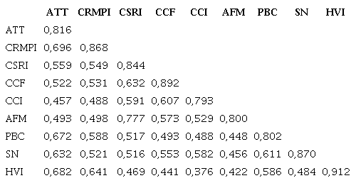 This study assessed the measurement model by examining two types of validity, namely convergent validity and discriminant validity. Convergent validity of the measurement model is generally verified by determining the loading, Cronbach’s alpha, composite reliability and average variance extracted (AVE) (Gholami et al., 2013). As shown in Table 2, the indicators’ outer loadings for all items exceeded the recommended value of 0.5 (Hair et al., 2010). The Cronbach’s alpha values of all constructs were above 0.7, which indicates internal consistency (Nunnally & Bernstein, 1994). The composite reliability values had a range of 0.887-0.952, which was greater than the threshold level of 0.7 (Hair et al., 2010). The AVE had a range of 0.628-0.831, which was greater than the cut-off value of 0.5 (Hair et al., 2010).