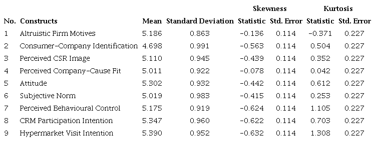 Table 4 shows the descriptive statistics and normality test of the constructs. Based on the result, the CRM factors (Altruistic Firm Motives, Consumer-Company Identification, Perceived Corporate Social Responsibility Image, and Perceived Company-Cause Fit) that would motivate consumers to participate in a CRM campaign recorded mean scores above 4 on a 7-point Likert scale (where 1 = Strongly Disagree and 7 = Strongly Agree). In other words, the respondents agreed that their preferred hypermarket exhibited altruistic firm motives, consumer-company identification, a perceived corporate social responsibility image, and a perceived company-cause fit.