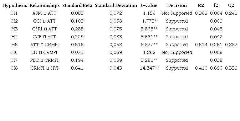 Hypothesis testing in this study was performed by evaluating the structural model. The coefficient of determination (R2), the beta and the corresponding t-values were assessed by running a bootstrapping procedure with 1,000 resamples (Hair et al., 2014). Aside from these basic measures, predictive relevance (Q2) and effect sizes (f2) were also reported (Hair et al., 2014). As shown in Table 5, six out of the eight hypotheses were supported. Firstly, CCI (β = 0.103, t-value > 1.645), CSRI (β = 0.288, t-value > 1.645) and CCF (β = 0.229, t-value > 1.645) were all positively related to attitude towards CRM. Thus, H2, H3 and H4 were supported but not H1 (AFM; β = 0.083, t-value < 1.645). In total, CCI, CSRI and CCF explained 36.9% of the variance in attitude. Secondly, attitude (β = 0.519, t-value > 1.645) and PBC (β = 0.194, t-value > 1.645) were positively related to CRM participation intention. Therefore, H5 and H7 were supported but not H6 (SN; β = 0.075, t-value < 1.645). Overall, attitude and PBC explained 51.4% of the variance in CRM participation intention. Lastly, CRM participation intention (β = 0.641, t-value > 1.645) was positively related to hypermarket visit intention, explaining 41% of the variance in hypermarket visit intention. Thus, H8 was supported. The R2 values all exceeded the 0.35 value, which implies a substantial model, as suggested by Cohen (1988).