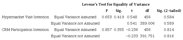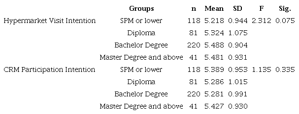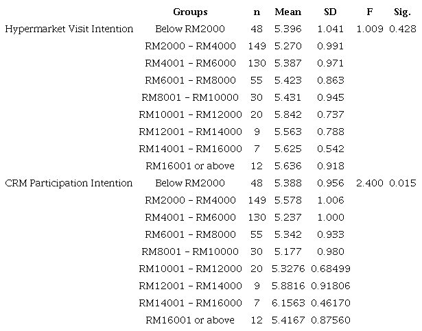 An additional analysis was performed to uncover differences in hypermarket visit intention and CRM participation intention across the various respondent profiles, such as gender, education level and monthly income. An independent sample T-test and one-way ANOVA were employed for this purpose and the results are shown in the tables of Appendix 2. There were no significant differences in hypermarket visit intention between genders, educational levels and income levels. As for CRM participation intention, no differences between genders and educational levels were found, but there was a difference between income groups. Apparently, those with a higher income (RM12000 - 16000) (USD2904 - 3871) were significantly more likely to participate in CRM than other income groups.