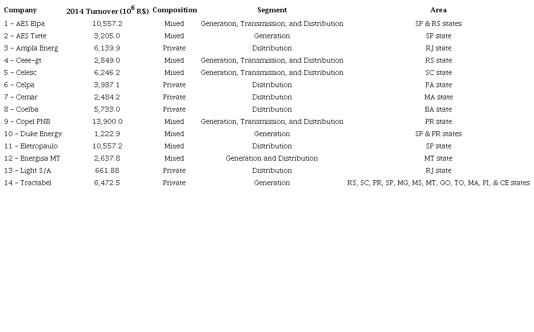 The publicly-traded companies in the Brazilian electricity sector selected were therefore those with publicly-available financial data. As in Dang (2011), companies that had no data in any of the periods analyzed were excluded. After applying these criteria, the sample consisted of 14 companies operating in the electricity generation, transmission, and distribution segments. Due to the small number of companies, it was not possible to restrict the study to only one of the aforementioned segments.
