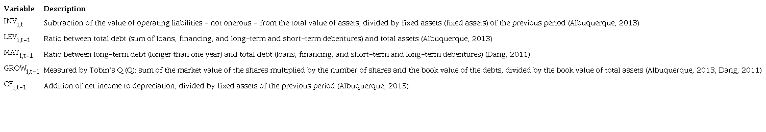 In theory, it is expected that the negative effect created by debt on the level of investments will be mitigated through corrective actions, such as reducing debt maturity and reducing debt itself (Aivazian, Ge, & Qiu, 2005). Short-term debts, according to Nakamura, Jucá, and Bastos (2011), allow their maturation to occur before growth opportunities materialize. Thus, they can ensure that the gains from new projects not only go to creditors.